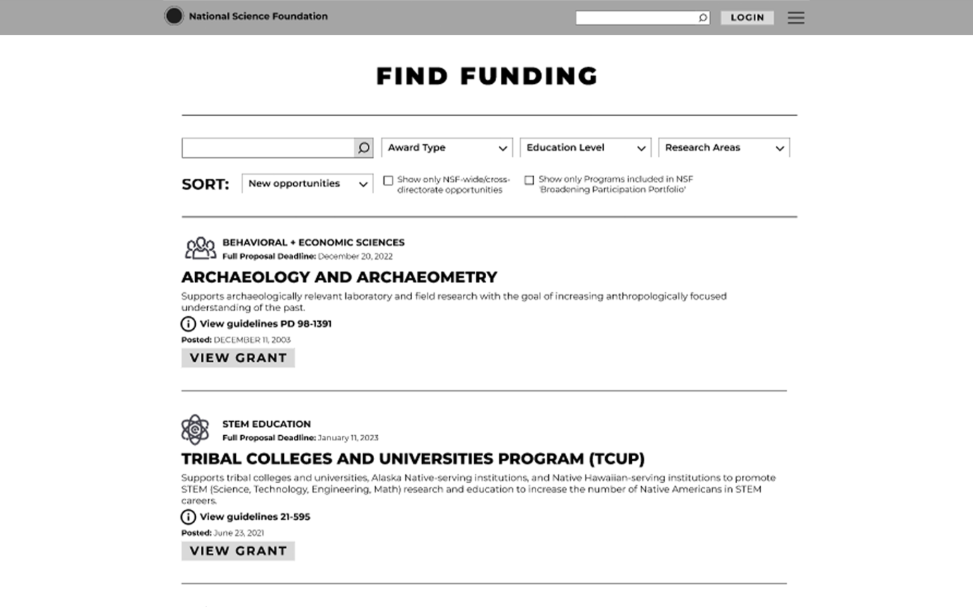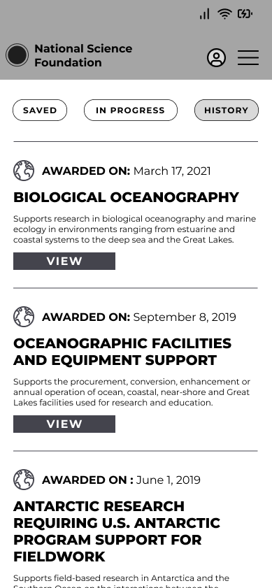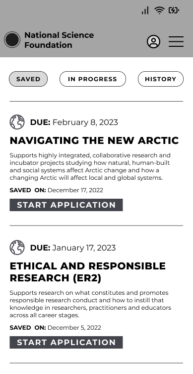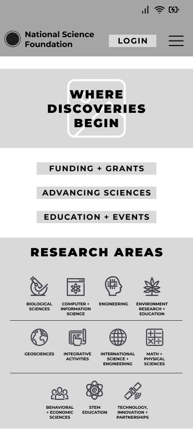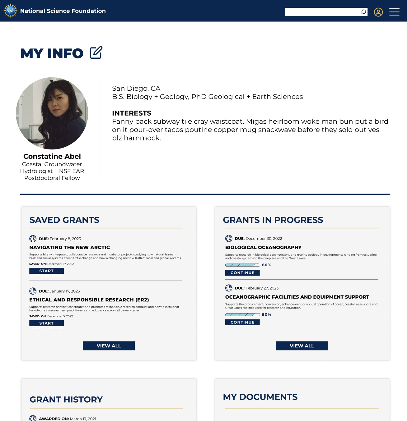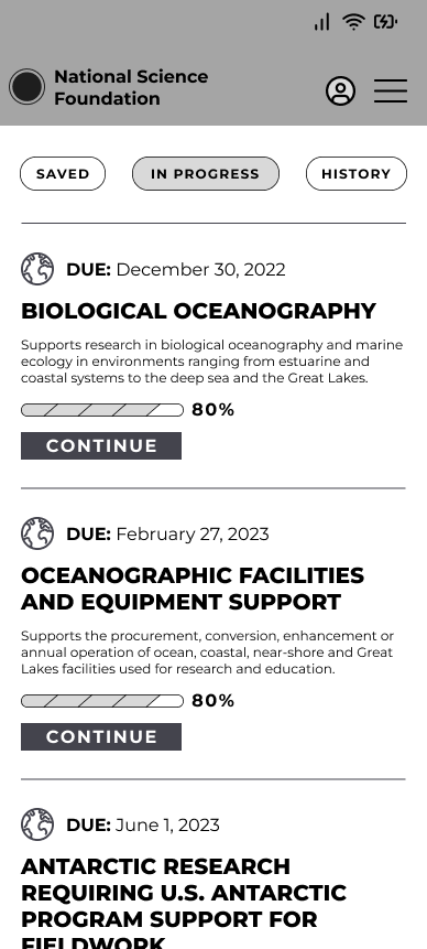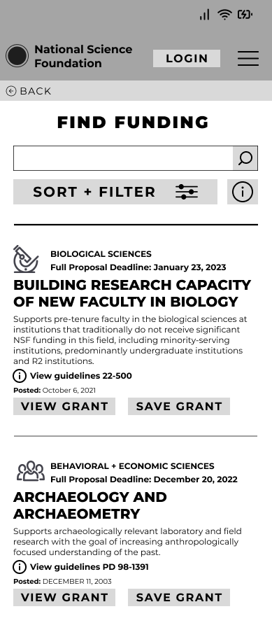 The National Science Foundation wants to establish user needs and create a mobile prototype that enables users to apply for research grants/funding that would expedite academic and research institutions to conduct research effectively. The website has seen a significant increase in mobile traffic, though it is not optimized for mobile usage. Users state that the website is difficult to interact with, and challenging to find basic information. The site has poor visuals, leading to accessibility concerns, confusion, and frustrations.