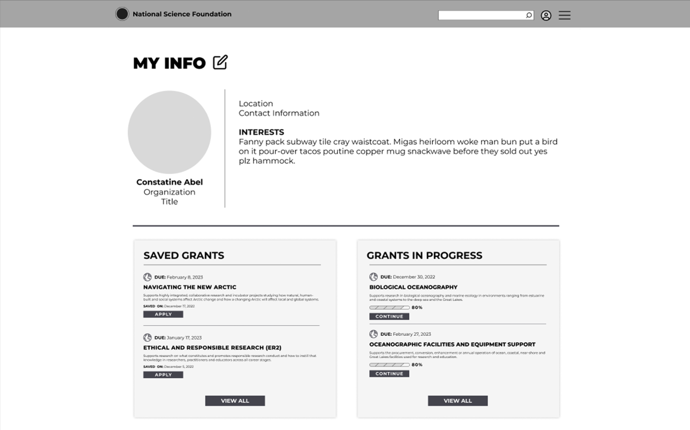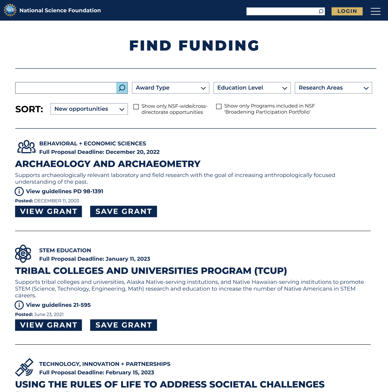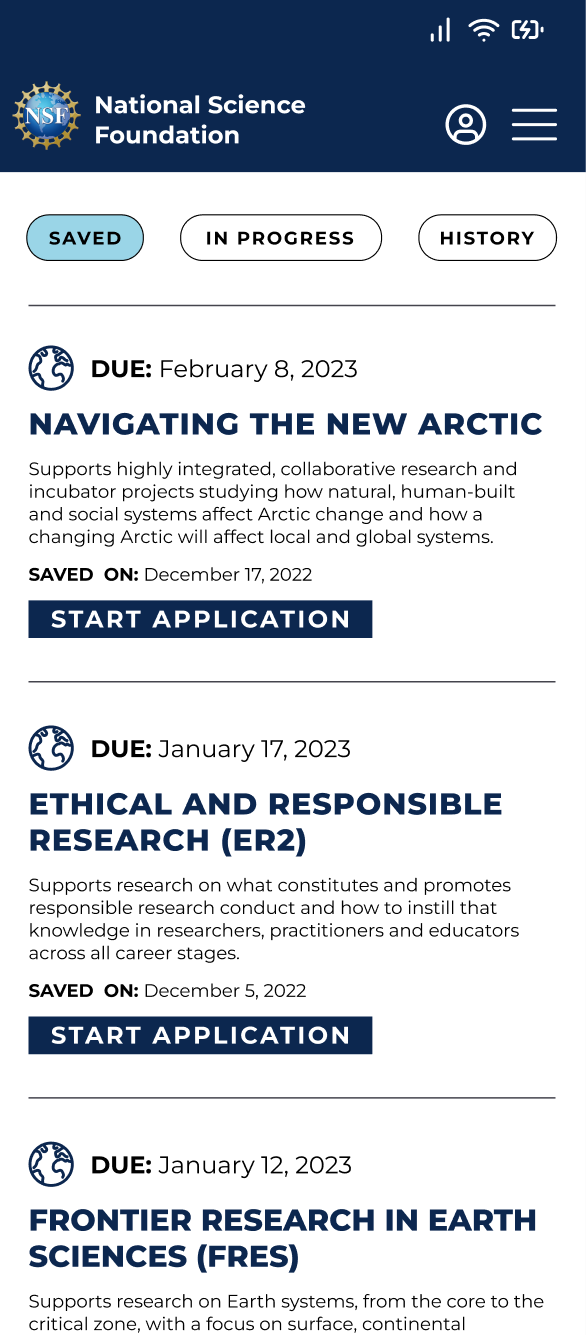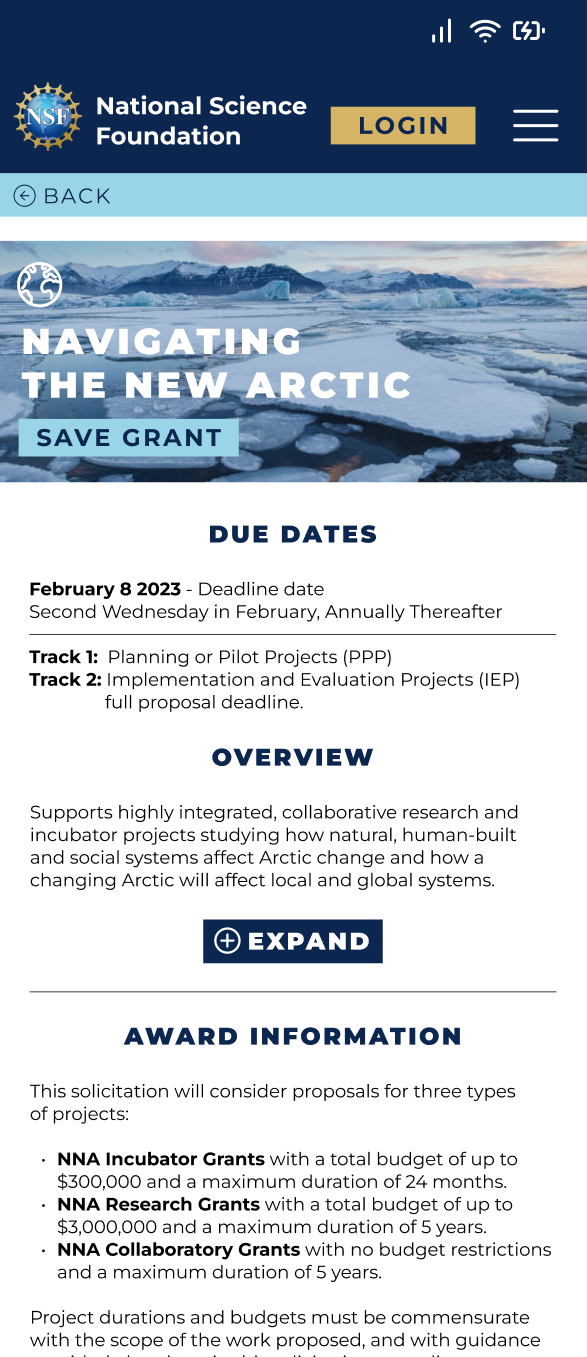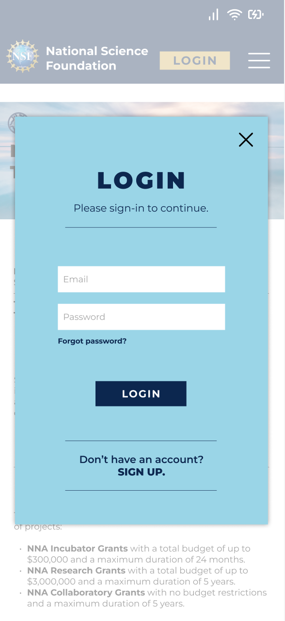 The National Science Foundation wants to establish user needs and create a mobile prototype that enables users to apply for research grants/funding that would expedite academic and research institutions to conduct research effectively. The website has seen a significant increase in mobile traffic, though it is not optimized for mobile usage. Users state that the website is difficult to interact with, and challenging to find basic information. The site has poor visuals, leading to accessibility concerns, confusion, and frustrations.